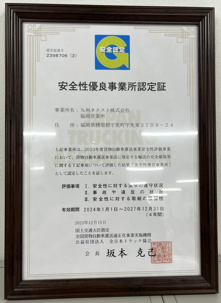 お知らせ 安全性優良事業所(Gマーク)に認定されました。 2023.12.26 お知らせ 九州ネクスト本社が2023年度貨物自動車運送事業安全性評価事業において「安全性優良事業所」として2023年12月15日に全日本トラック協会より認定されました。 お知らせ 一覧へ